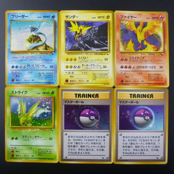 | ■商品内容■ ポケモン 任天堂 メディアファクトリー 旧裏面ポケモンカードゲームから、クイックスターターギフトに収録された、キラ仕様カード6枚です。 ・「フリーザー」 ・「サンダー」 ・「ファイヤー」 ・「ストライク」 ・「マスターボール」×2 (注意) 中古品としての出品ですので、状態に関し神経質な方は入札をお控えください。 また、画像には全てを載せきれない為、画像以外の部分にダメージがある可能性もありますので、 その旨ご了承頂き、気になる点は必ず事前にご質問をお願い致します。 (営業時間内であればすぐに回答差し上げますので、時間に余裕を持ってご連絡下さい。) ■商品状態■ カードによって、多少のスレや軽い傷み等が見られますが、いずれも大きく目立つダメージは特に見られず、古いカードとして状態は良好と思われます。 商品は画像にあるものが全てです(画像にリフィルが写っている場合は、撮影用の備品であり、商品には含まれませんのでご了承くださいませ)。 詳細は画像にてご参照ください。 現状でのお引渡しとなりますので状態に十分ご理解いただいた上での入札をお願い致します。 - 商品ページの画像、説明にない不備があった場合に限り返品を承りますので安心してご入札下さい。 返品ご希望の方は商品到着日から5日以内に取引ナビにてご連絡下さいますようお願い致します。 尚、返送の際の送料は当店負担とさせて頂きます。 ※1 お客様都合による返品は一切お受け致しておりません。 ※2 商品ページにジャンク品/処分品と明記されている物を除く - 商品に関し気になる点はお気軽にご質問をお願い致します(即決のご依頼は金額に関係なくお断りさせて頂きます) - 営業時間外(平日AM10:00~PM5:00)でのご質問のお答えは致しかねますので、時間に余裕を持ってご質問下さい - 画像の物が全てです。画像にある以外のものは御座いません - 中古品としての出品となりますので、細かい状態を気になさる方はご入札をお控え下さい | ||||||