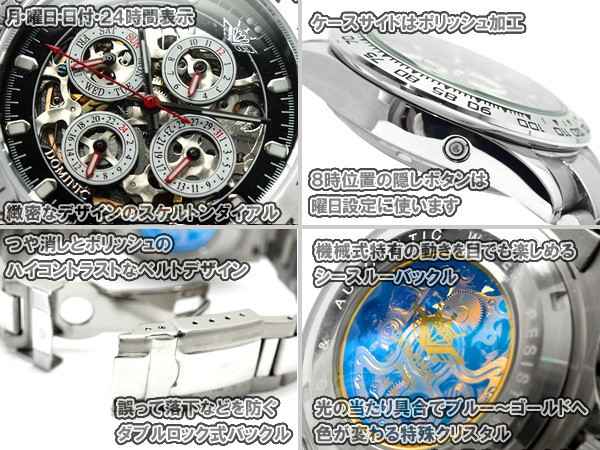 | 商品説明 | ドミニク-DOMINIC-(神に属するもの)とは、中世ヨーロッパの時計職人ギルドの伝統を受け継ぎ、尚且つ、素材にはタングステン(レアメタル)をはじめとした希少素材を使用し、高品質、高機能を具現してます。 プレゼントやギフトにもおすすめ。 DOMINIC 機械式時計の聖地である「時計の町」スイス・ジュウ渓谷で修業を積んだマスターが、一点一点手仕事による職人技で組上げる、豪胆でいて優雅な壱品です。 中世ヨーロッパの時計職人ギルトの伝統を引き継ぎ、尚且つ、素材にはタングステン(レアメタル)を 初めとした希少素材を使用し、また随所に先端技術を組み込み、高品質・高機能の具現しています。 DOMINIC(ドミニク)奇抜なデザイン性と面白いギミックが注目を集めているドミニク時計のご紹介です。 時計中に存在するあらゆる機能をデザインへ転換していく様は目がはせません。 また、こんなに充実した機能とは裏腹にとてもお買い求め安い価格設定なので、コレクターズアイテムとしても楽しめます。 DOMINIC(ドミニク)奇抜なデザイン性と面白いギミックが注目を集めているドミニク時計のご紹介です。 時計中に存在するあらゆる機能をデザインへ転換していく様は目がはせません。 また、こんなに充実した機能とは裏腹にとてもお買い求め安い価格設定なので、コレクターズアイテムとしても楽しめます。 ■ケース:(約)縦48×横45×厚さ14mm、腕周り:(約)~185mm、重量:約138g ■ムーブメント:自動巻き ■素材:ステンレススチール ■仕様:カレンダー(日付・曜日)、24時間表示、スケルトンスクリューバック ■防水:日常生活防水 |