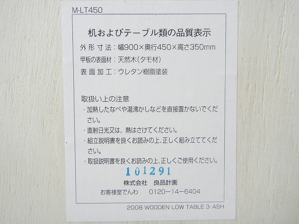 無印 MUJI タモ材 木製 テーブル M-LT450 幅90cm 引出付O1739745