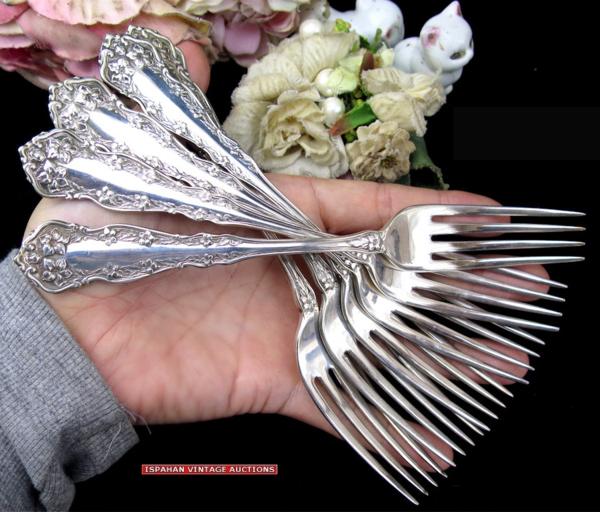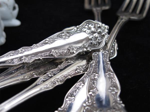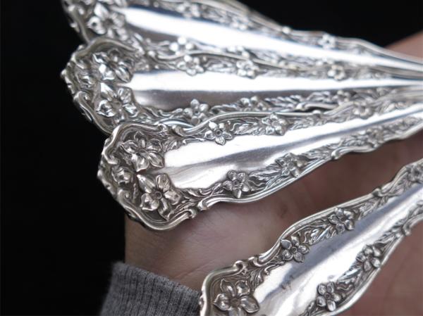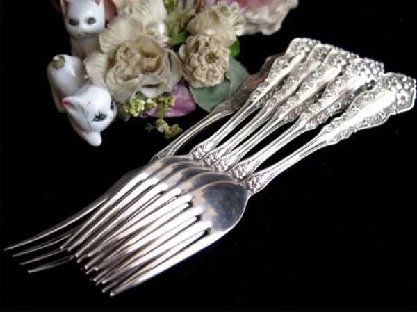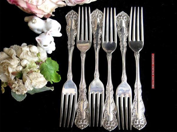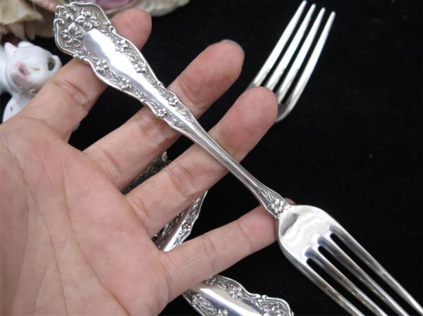 1890-1910年前後頃 US R.C. Co. ROGERS 純銀プレート フォーク 17.6cmサイズ、6本 Model “CHESTER” 繊細優美な花柄縁取りを前後面にデザイン、美しい19世紀装飾美術アールヌーボーのシルバーカトラリー、使用経年を起因とする表面の微細なスクラッチ傷等が見られますが使用の程度を越える粗雑な扱いに起因する傷み等はありません、概ね鏡面光沢を有するエレガントなエクセレントコンディション、製造から相当年経過したアンティークです著しい傷み、破れ、不具合、欠損などが無い限りご返品はお受け出来かねます、前もって、使用・経年の範疇における、劣化や傷み等は時代の色として許容出来る方のみ、ご入札お願いします。 =================================================================================== 郵便振替・銀行振込にてお願いします、かんたん決済は利用しておりません。 簡易梱包手数料込み定型外郵便250円保証無し、 60サイズ、梱包はリサイクル資材使用、ゆうパックでお願いします。 ゆうパック運賃表 ストア出品と成ります、お支払合計は、落札代金 + 送料 + 消費税です、 落札者様には、落札後24時間以内でのご返信と、3営業日でのお支払いを希望します、 同梱発送は落札日を含め三日以内で承けたわります、よって、初回の落札日より 数えて3営業日でのお支払にご協力下さい。 * かんたん決済利用許可商品の発送は、原則として、当方宛口座入金日とさせて頂きます、 お手続き日より起算し、5~10日前後必要です、 可能な限り、郵便振替、銀行振り込みをご利用下さい。 お取引は、ストア専用オーダーフォーム利用です、落札後24時間以内の入力に協力下さい。 =================================================================================== ヤフーよりの落札通知メイルに連絡先の記述があります、御確認下さい、終了時間が夜遅くと成りますので、翌午前中までに、詳細を連絡させて頂きます、24時間以内のご返信、3営業日前後で支払い・発送手続きの完了が希望です、また、多くのオークション終了日が祝日、週末に設定されており、最終日は終日不在がちです、ご質問は、十分余裕を持って、お早めに頂けますよう願います。 *新規、及び 非常に良い・良いの評価が95%未満の方は、入札/取引をお断りさせて頂く場合がございます、あらかじめご了解下さい。 出品は、アンティークとなりますために、美術・工芸作品の扱いになります、Silver Plate 製品です、タイトルでは、字数制限のため、純銀P. EPNS 等と表記、本文中では、純銀プレート、 Silver Plate、Métal argenté 又は、単にEPNS 等と表記しています、これら銀器は、柔らかく、扱い難い純銀無垢スターリングシルバーに対し、主に洋白と呼ばれる特殊配合地金をベースに用い、表面にスターリング プレート(純銀99.99%によるメッキ処理)を加える事で、固く、キズに強く、銀と同じ光沢性質で、表面にのみ、純銀を用いる事で、銀の使用量を減らし、価格が押さえられるメリット、あるいはデザインの多様性に着目し、1800年代末頃から盛んに製造された品です、比較的安価に楽しめ、高い人気があります、加えて銀の持つ神秘性、伝統、特有の光沢があり、生活器、そして、銀としての魅力を十分感じて頂けると思います。 西洋骨董を中心に多数出品しています、ぜひ、その他のオークションもご覧下さい。 出品者のその他のオークションを見る!!! 出品は、アンティークです、鑑賞を目的とした、美術・工芸作品扱いでの販売です、使用される場合、未テストのため、何らかの手直しが必要となる場合があります、衛生は自己責任にて願います、コンディションには、時代に沿い相応なキズ汚磨耗があります、それらが、通常使用範囲にあると判断の場合、個々の傷みにたいして記述は致しません、状態の感じ方は個々温度差あり、記載の無い傷みがあるとクレームを受けることがありますが、商品の情報に対しどこまで記述を行うかは、あくまで出品者主観の判断に基づきます、貴方がアンティークに不慣れな場合、想像より汚れ、傷みがあるとの前提にて応札下さい、、、 年代や寸法など数値が記載される場合、簡易計測による見立て・目測ですので、すべて大まかな参考値として利用下さい、正確な値が必要な方は、測定基準となる位置・方法を明記し、御手数ですがご質問下さい、同様に、画像、説明文のみでは、明瞭に確認出来ない箇所や、専門用語、不明瞭箇所があれば、入札の前に、ご質問ください、記載内容には十分注意を払っておりますが、人が行うデータ入力作業はミスがつきものです、追加画像も含め、必ずご自身で確認・判断下さい、画像確認出来る範囲の些細な記入ミス、記入の有無に関しては、瑕疵担保責任を放棄いたします、ご自身で詳細に画像を確認の上、入札頂けますようお願いします、入札後、様々な見込み違い、落札者様の認識不足、意味取り違え、勘違い、中古、アンティーク商品の、傷、汚れなど、コンディションを理由とした、落札の取り消し、 