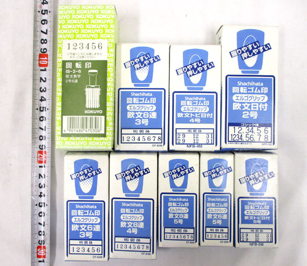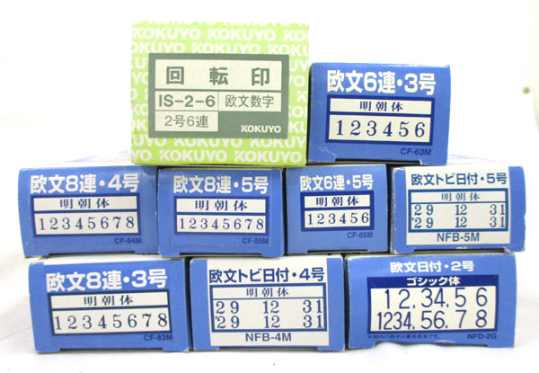 | 内 容 | ■回転ゴム印 ・欧文8連 4号×2点 ・欧文8連 5号×2点 ・欧文日付 2号×1点 ・その他×6種6点 ※箱に多少汚れがあります ※画像をご参考ください |