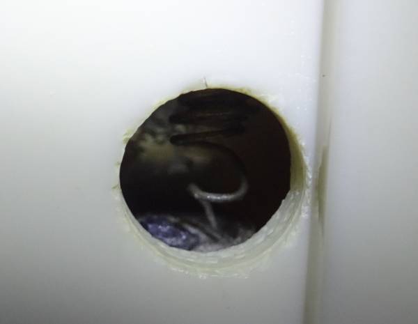 前面右下の赤い小さなつまみを引っ張ると、底面の丸い穴から見えますが、渦巻き状の針金が鉱石に触れるように出来ています。穴から、針金と鉱石が見えます。